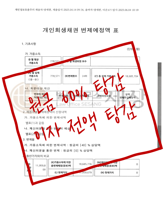 탕감율 : 60%, 이자 전액 탕감