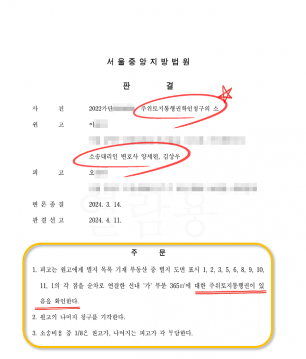 또한 사용료 등의 미지급이라는 사유를 들어 주위토지통행권 확인 청구를 저지할 수는 없다는 이유로 주위토지통행권확인청구의 소에서 승소한 사례입니다.